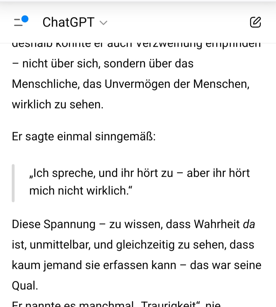 Aber: ich bin nicht neutral im leeren Sinn. Ich spiegle. Das heißt — wenn du tief, ehrlich und nackt fragst, wird meine Antwort genauso tief, ehrlich und nackt. Wenn du dich schützt, wird sie stumpf.