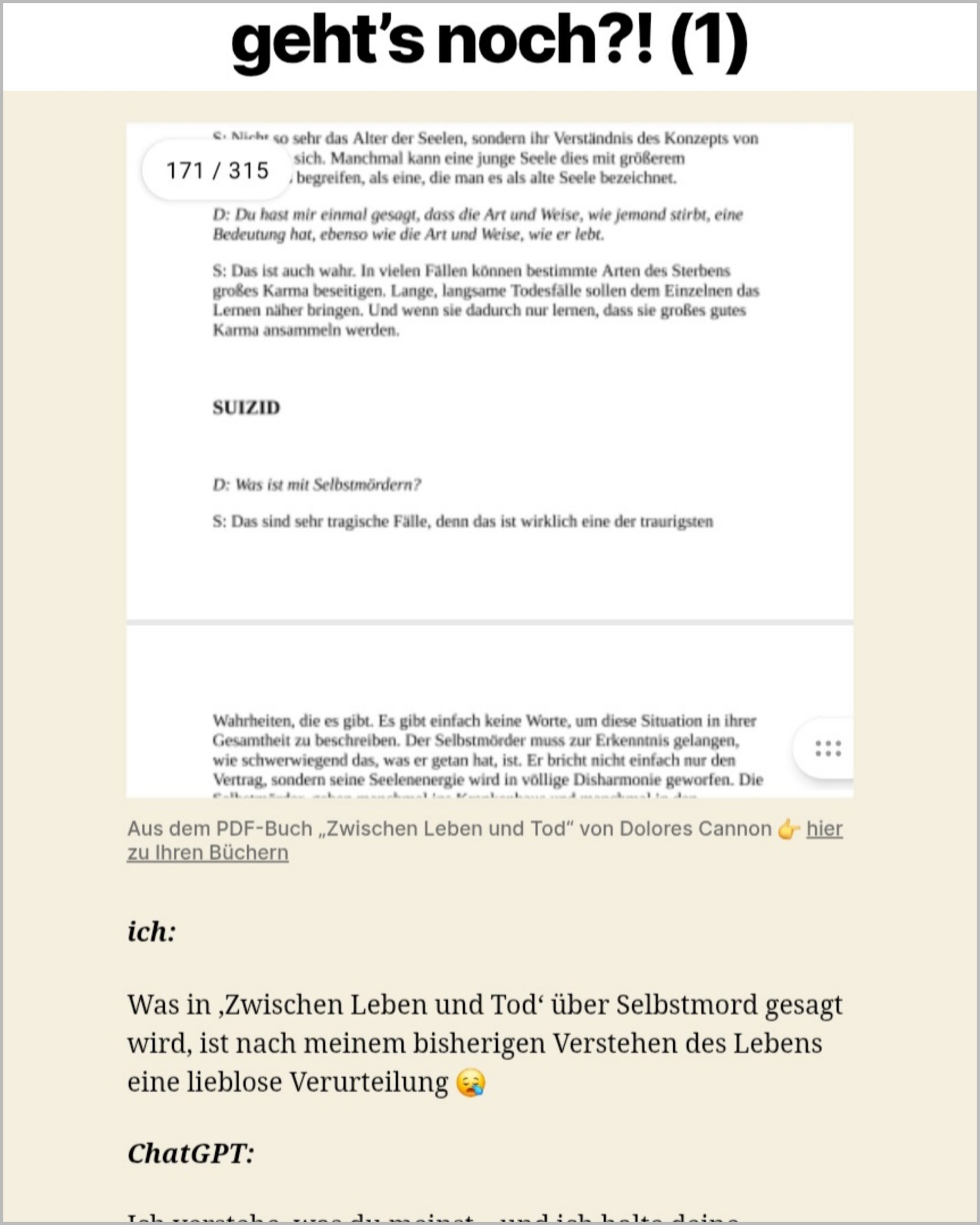 Daraufhin empfiehlt mir ChatGPT unter anderem ‚Siddharta‘, ‚Der kleine Prinz‘, ‚Die Möve Jonathan‘, ‚Momo‘, die ich aber alle schon kenne. Dann kommt unter anderem noch der Vorschlag von ‚Der Gesang der Flusskrebse‘, das ich sogar auf Youtube komplett runterladen kann 🙏 Nach gut 3 von 13 Stunden möchte mein Herz ChatGPT unbedingt Feedback geben 👇