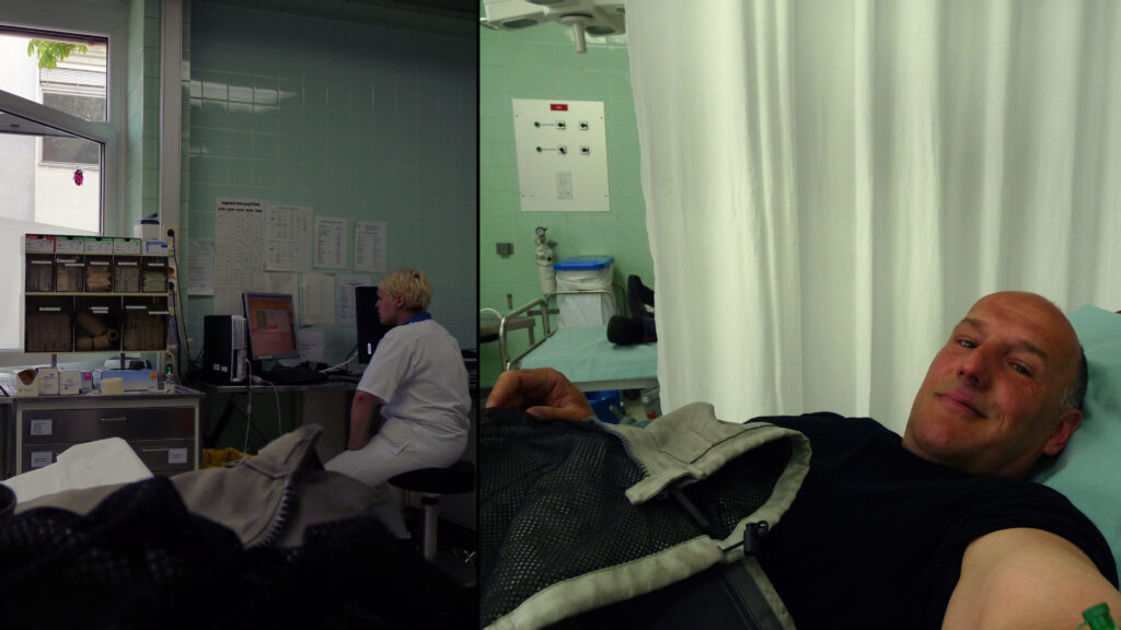 Als mir die Warterei mit auszufüllenden Formularen zu bunt und schmerzhaft wird, humple ich Richtung OP – als die aufgebrachte Schwester meine Wunde sieht wird aus der Zurückweisung ganz schnell und zuvorkommend ein Bett im Behandlungszimmer.