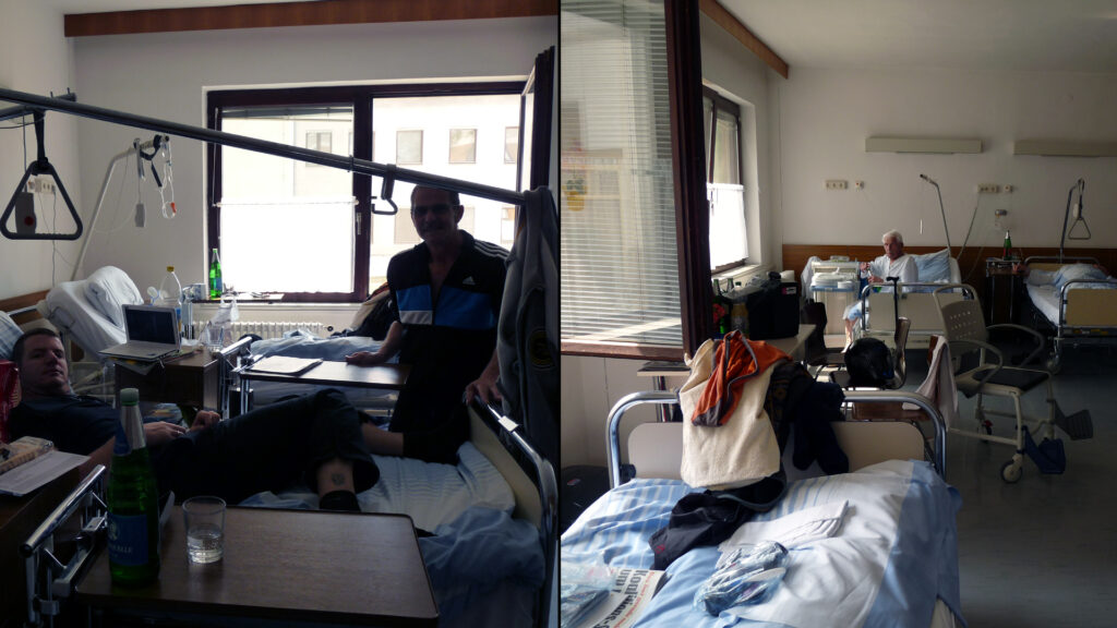 Irgendwie bekommt er die Haut über das Loch gespannt und zugernäht und bevor er sich entfernt meint er mich auf die Schulter klopfend: Respekt, so tapfer erwarte ich Straßenrowdies – mein junger Kollege wird jetzt noch die Trainage in die Wunde einführen und dann bekommen sie eine Gipsschiene und ein Zimmer – auf mein ich dachte ich könnte zur Beghütte weiterfahren meint er: ein paar Tage werden es mindestens bei der großen Infektionsgefahr!