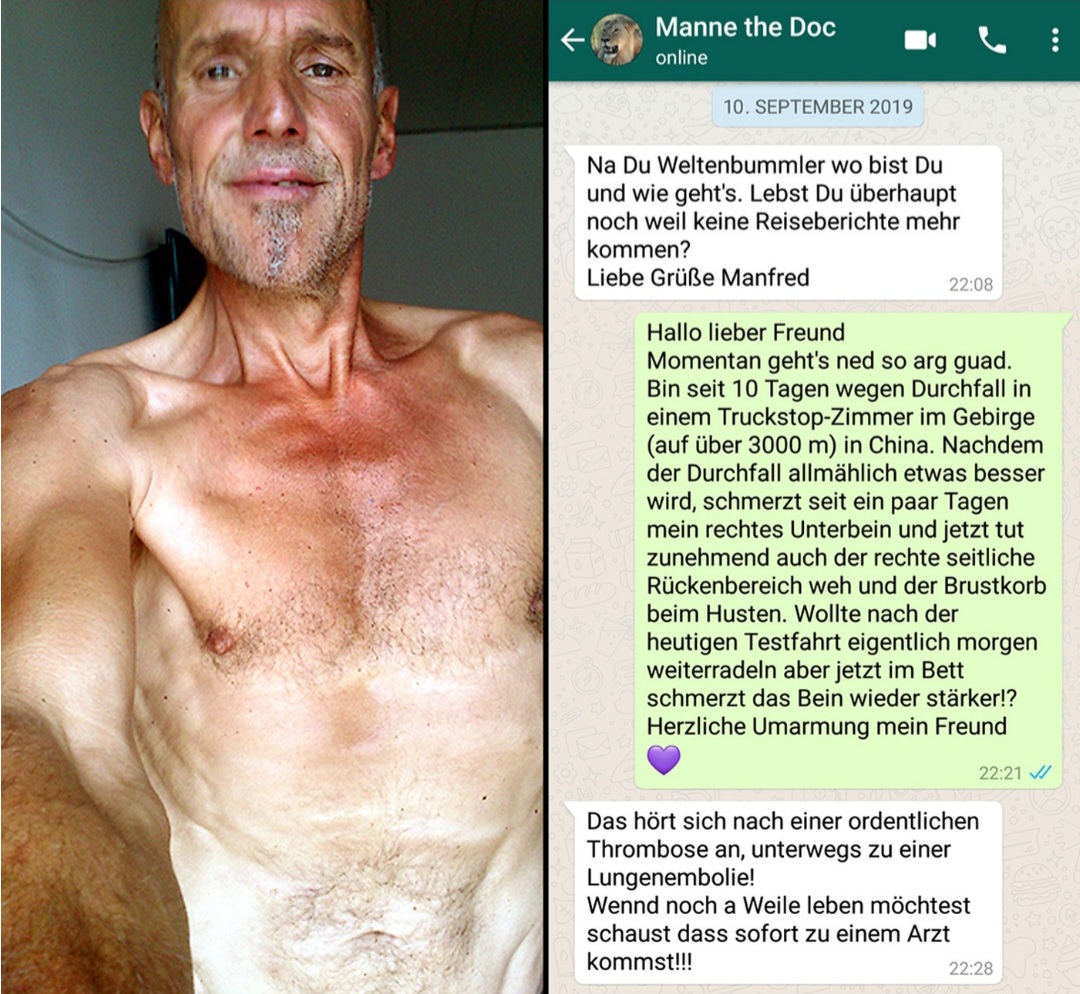 2016 auf meiner ungeplanten Radtour nach und durch China habe ich, nach 3 Tagen mit schwerem Durchfall in einem Truckstop-Zimmer im tibetischen Hochgebirge ruhend, durch starke Schmerzen im rechten Unterbein das Gefühl, dass es gefährlich sein könnte und als nach 9 Tagen auch noch Schmerzen in der rechten Körperseite und in der Lunge dazukommen, bin ich mir bewusst, dass es lebensgefährlich ist – auch weil ich, vorm Start der ungeplanten Tour außer der Mongolei, wichtiger Seelen-Begnung und Gefängnis auch die Intuition von schwerer Krankheit oder Tod hatte – und die Mongolei sowie Seelen-Begegnung sich schon bewahrheitet haben.